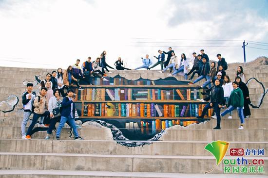 據(jù)了解,這一“3D”圖書(shū)臺(tái)階涂鴉是蘭州大學(xué)藝術(shù)學(xué)院2016級(jí)環(huán)境設(shè)計(jì)學(xué)生為給榆中校區(qū)增添更多色彩而設(shè)計(jì)繪制的。經(jīng)過(guò)一個(gè)學(xué)期的申請(qǐng),一個(gè)星期的繪制,在全班學(xué)生共同努力下完成。