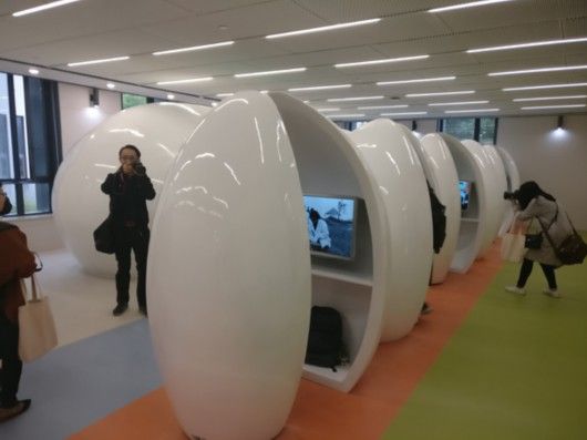 而在二樓,還有一個區(qū)域?qū)iT擺放了一個個“太空艙”。這一名為視聽艙的設(shè)備配有觸摸屏,學(xué)生可以多人或單人在里面看視頻,聽音樂。館方希望能為學(xué)生提供更多休閑的空間。