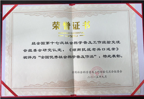 近日,2016年湖南省社科普及主題活動周啟動式在常德舉行,會議對2015年全國優(yōu)秀社科普及專家、基地、讀物、工作者等進行了表彰,湖南圖書館編著的著作《湖南抗戰(zhàn)老兵口述錄》榮獲“全國優(yōu)秀社會科學普及作品”獎項,湖南圖書館副館長鄒序明參會領獎并發(fā)言。