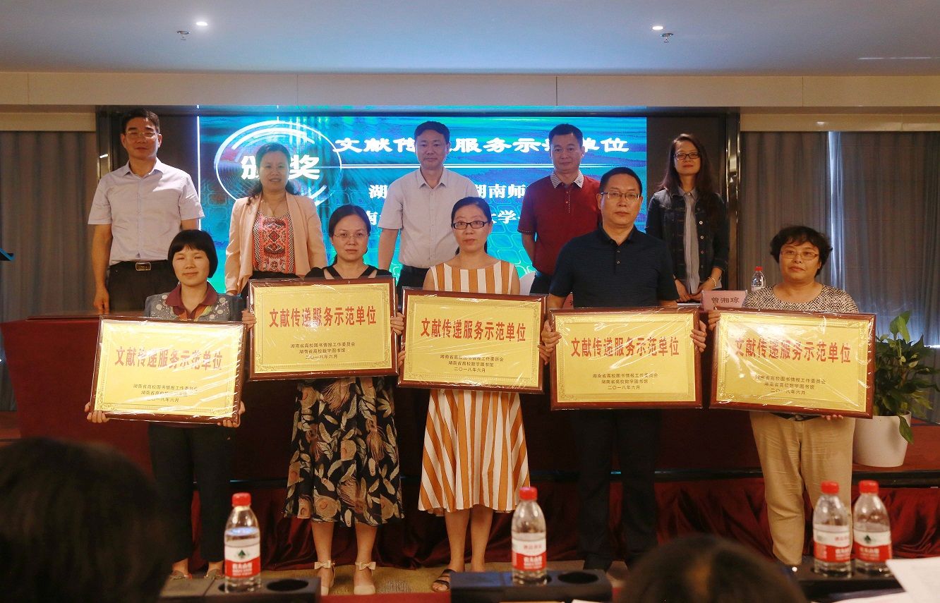 接著湖南師范大學圖書館副館長龔曉林宣讀了湖南省高校數(shù)字圖書館文獻傳遞服務示范單位、資源共享服務先進單位評選結果,主席臺上的領導和嘉賓為獲獎單位頒發(fā)了獎牌。湖南大學圖書館研究館員何平老師、吉首大學圖書館副研究館員劉曉鳳老師、湖南文理學院圖書館劉安吾館長作為獲獎單位代表分別對本校的文獻傳遞服務工作做了總結,并分享了先進經(jīng)驗。
