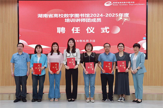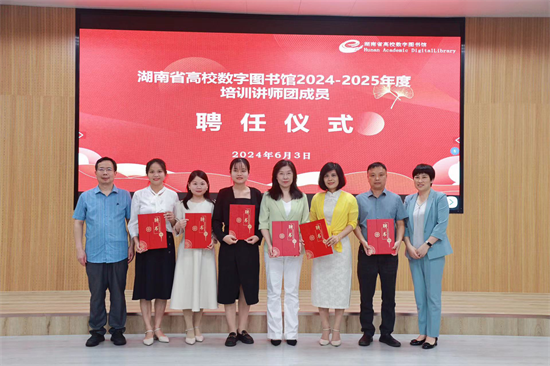 2024年6月3日上午,湖南省高校數(shù)字圖書(shū)館培訓(xùn)講師團(tuán)成員聘任儀式在湖南師大圖書(shū)館隆重舉行。湖南省高等學(xué)校圖書(shū)情報(bào)工作委員會(huì)(簡(jiǎn)稱(chēng)圖工委)秘書(shū)長(zhǎng)龔蛟騰、湖南師大圖書(shū)館黨總支書(shū)記羅曉慧出席,儀式由湖南師大圖書(shū)館副館長(zhǎng)胡開(kāi)勝主持。來(lái)自中南大學(xué)、湘潭大學(xué)、長(zhǎng)沙理工大學(xué)等10所高校的18位講師參加了儀式。